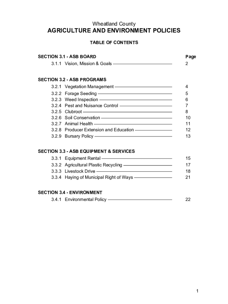 Wheat land CountyAGRICULTURE AND ENVIRONMENT POLICIES TABLE OF CONTENTS SECTION 3.1 ASB BOARD 3.1.1 Vision, Mission & Goals Page 2SECTION 3.2 ASB PROGRAMS 3.2.1 Vegetation Management 3.2.2 Forage
