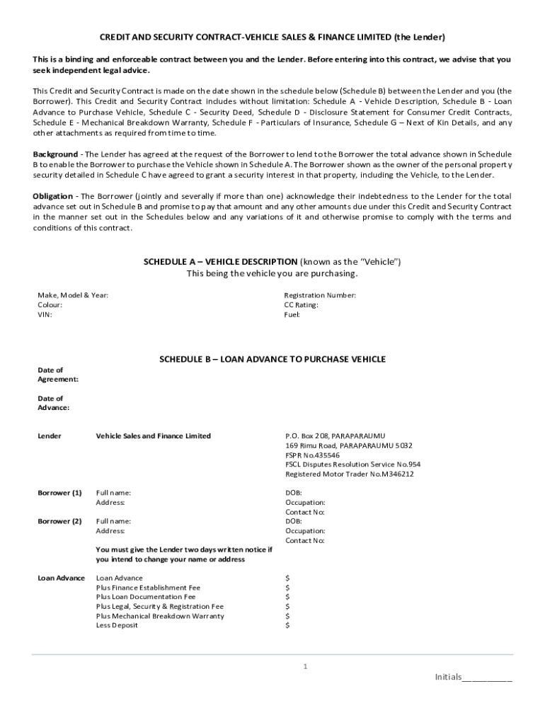 CREDIT AND SECURITY CONTRACTVEHICLE SALES & FINANCE LIMITED (the Lender) This is a binding and enforceable contract between you and the Lender. Before entering into this contract, we advise that you