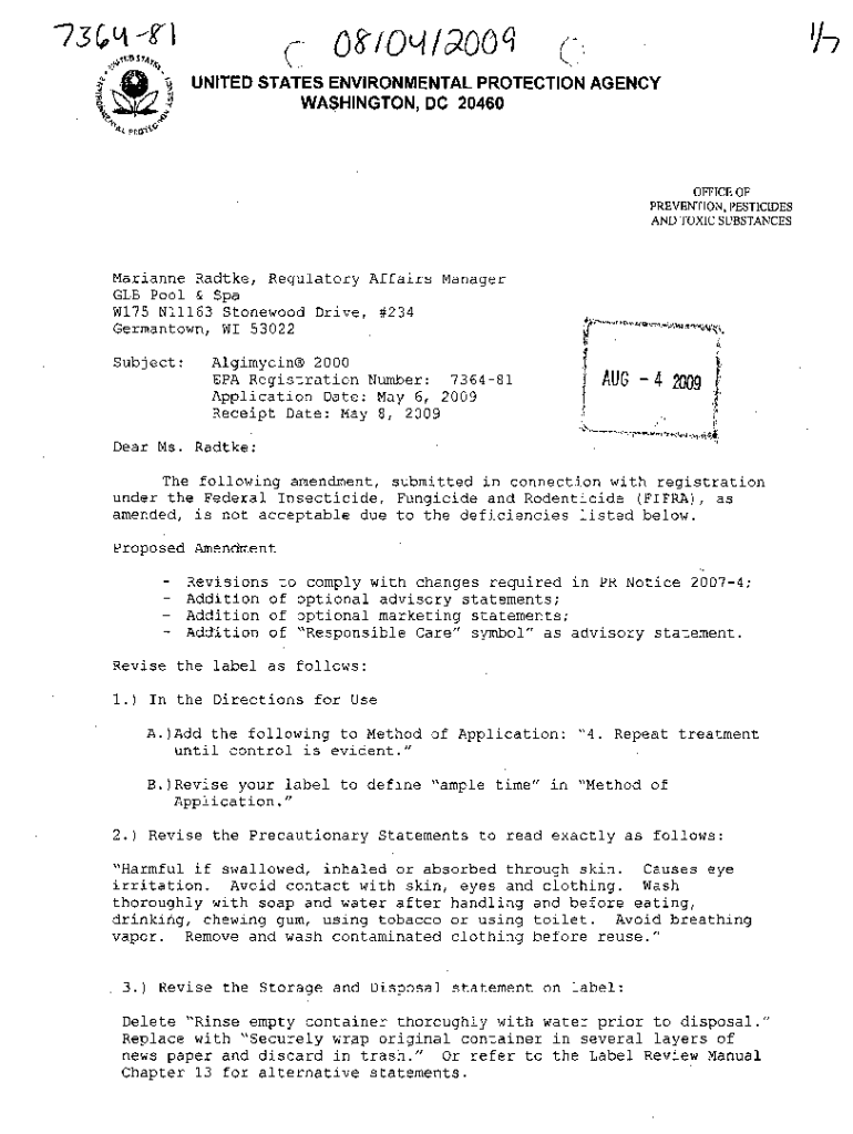 08\” BOY I ()OO q UNITED STATES ENVIRONMENTAL PROTECTION AGENCY WASHINGTON, DC 20460OFFICE OF PREVENTION, PESTICIDES AND TOXIC SUBSTANCES Marianne Rate, Regulatory Affairs Manager LB Pool & Spa