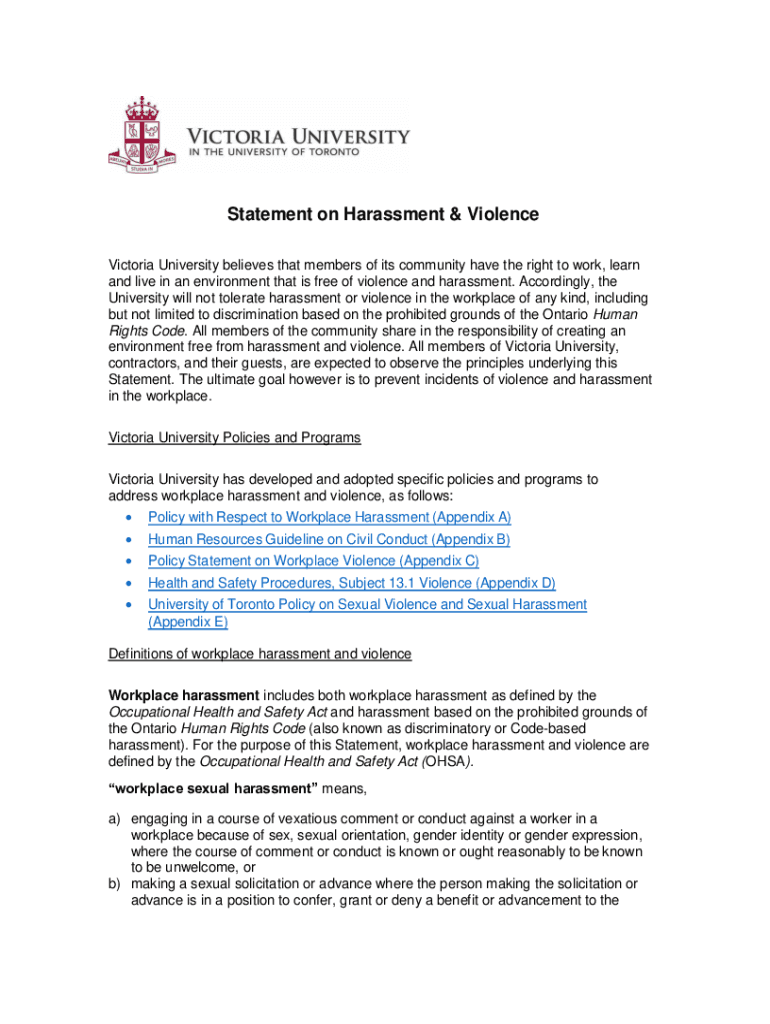 Statement on Harassment & Violence Victoria University believes that members of its community have the right to work, learn and live in an environment that is free of violence and harassment. Accordingly,