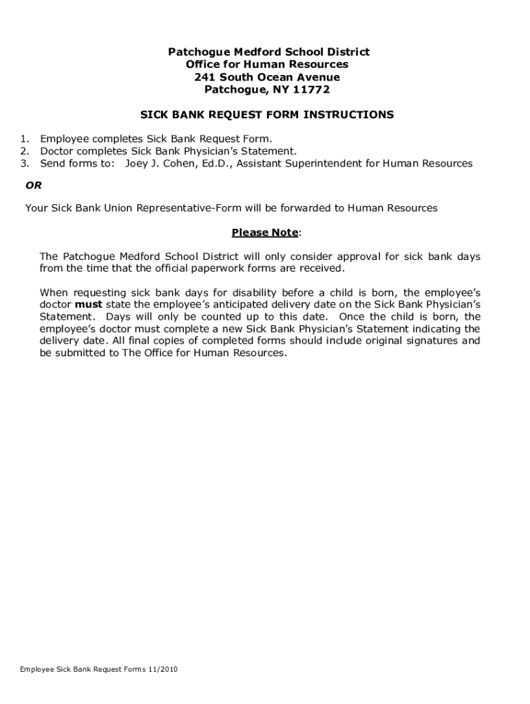 Pathogen Medford School District Office for Human Resources 241 South Ocean Avenue Pathogen, NY 11772 SICK BANK REQUEST FORM INSTRUCTIONS 1. 2. 3. Employee completes Sick Bank Request Form. Doctor