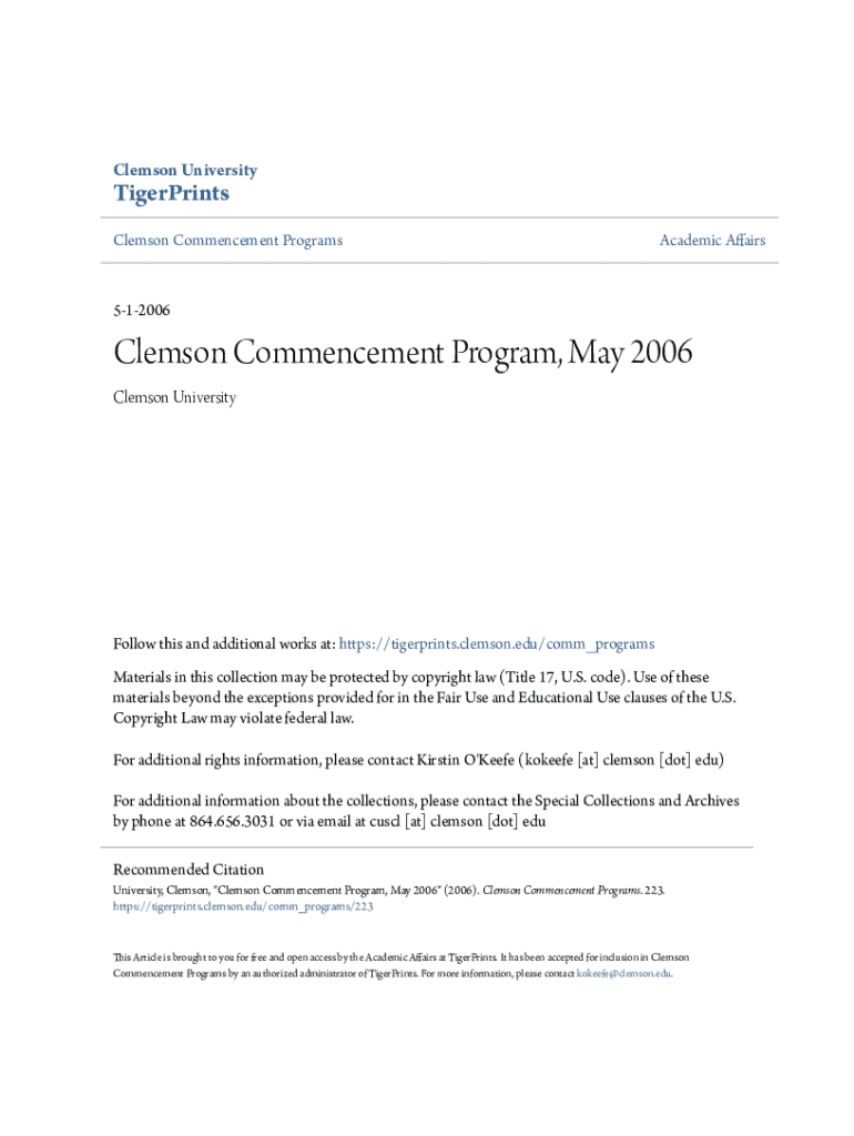 Clemson UniversityTigerPrints Clemson Commencement ProgramsAcademic Affairs512006Clemson Commencement Program, May 2006 Clemson UniversityFollow this and additional works at: https://tigerprints.clemson.edu/comm_programs