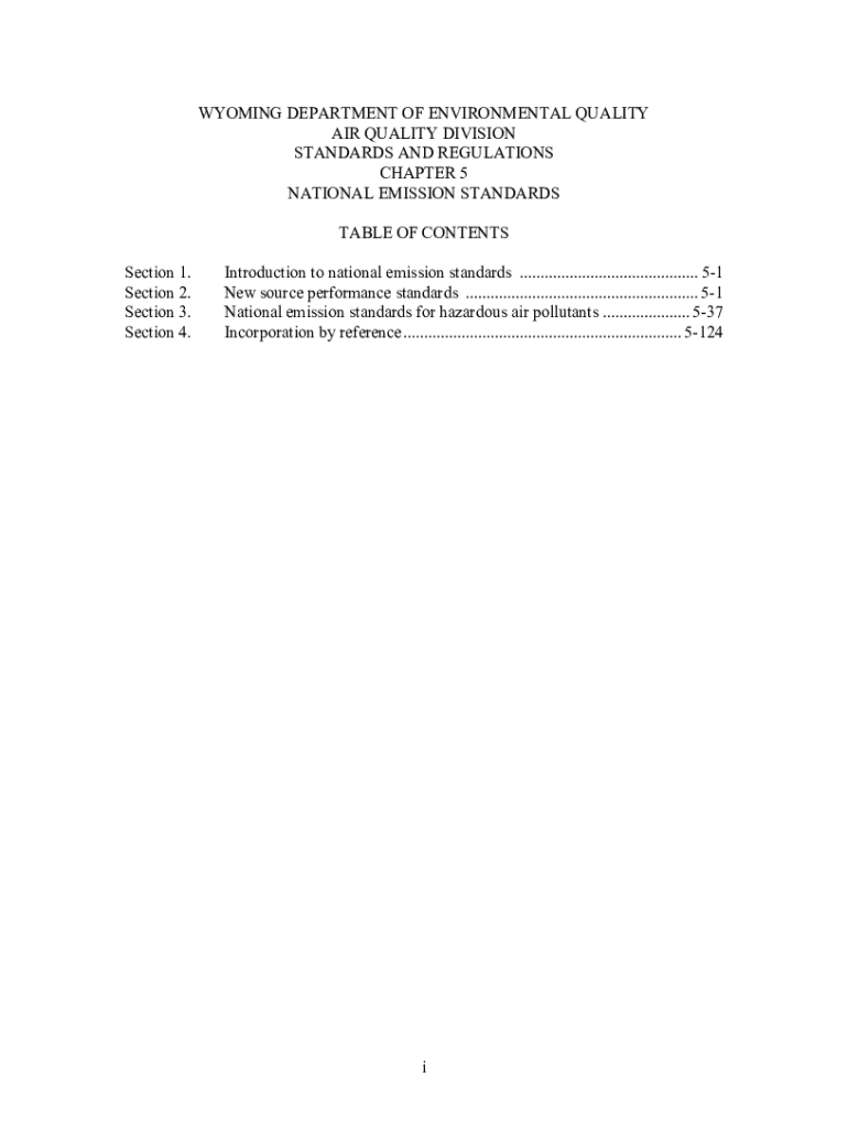 WYOMING DEPARTMENT OF ENVIRONMENTAL QUALITY AIR QUALITY DIVISION STANDARDS AND REGULATIONS CHAPTER 5 NATIONAL EMISSION STANDARDS TABLE OF CONTENTS Section 1. Section 2. Section 3. Section 4. Introduction