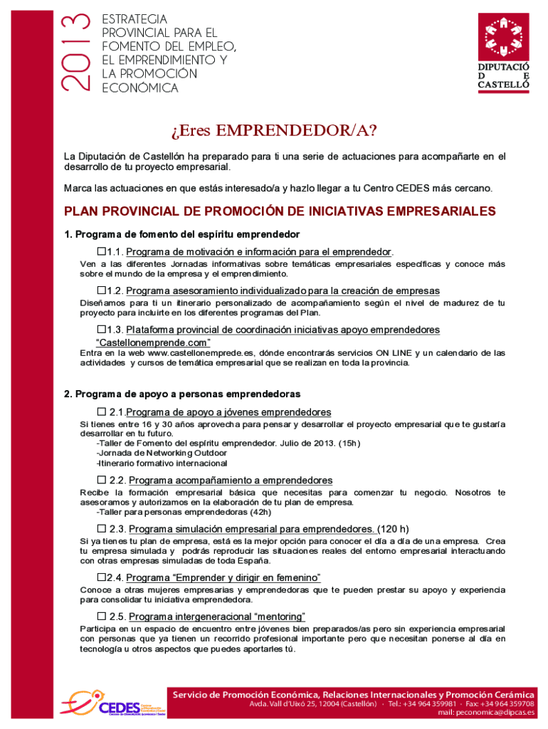 2013ESTRATEGIA PROVINCIAL PARA EL FOMENT DEL TEMPLE, EL EMPRENDIMIENTO Y LA PROMOTION ECONMICAEres EMPRENDEDOR/A? La Deputation de Castelln ha prepared para ti RNA series DE actuation para compare