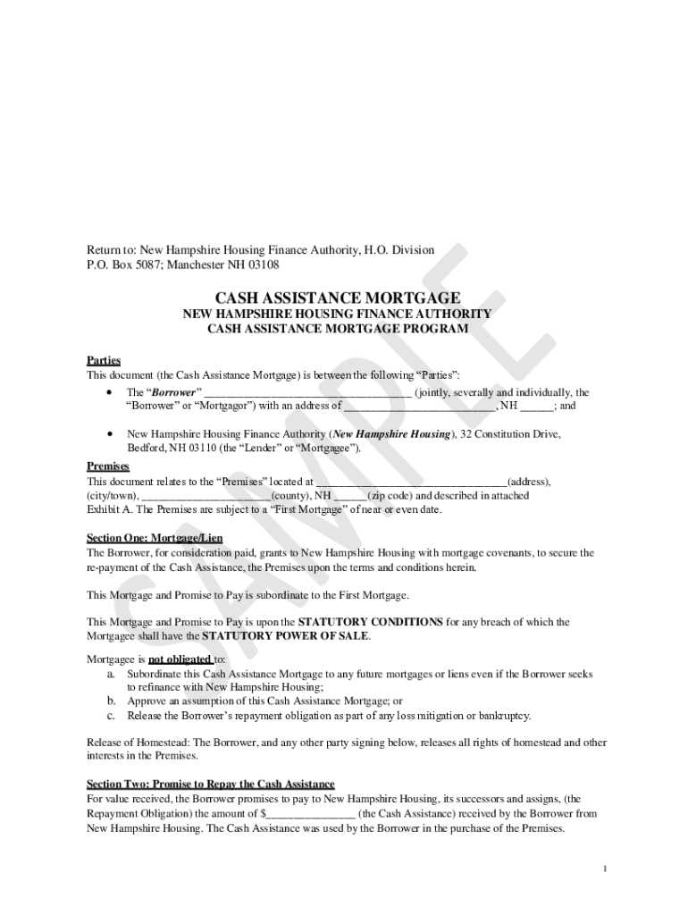 Return to: New Hampshire Housing Finance Authority, H.O. Division P.O. Box 5087; Manchester NH 03108CASH ASSISTANCE MORTGAGE NEW HAMPSHIRE HOUSING FINANCE AUTHORITY CASH ASSISTANCE MORTGAGE PROGRAM