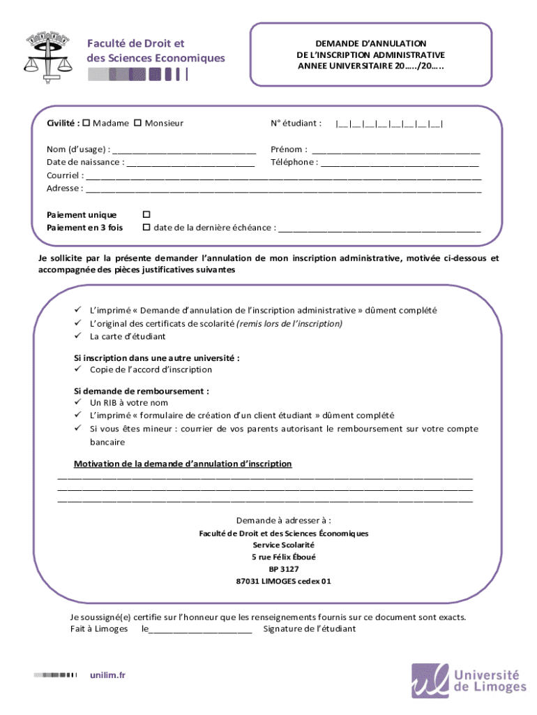 Faculty DE Droid et DES Sciences EconomiquesDEMANDE ANNULATION DEL INSCRIPTION ADMINISTRATIVE ANNE UNIVERSITIES 20./20. Civility : Madame Monsieur radiant :|__|__|__|__|__|__|__|__|Not (usage) : ___