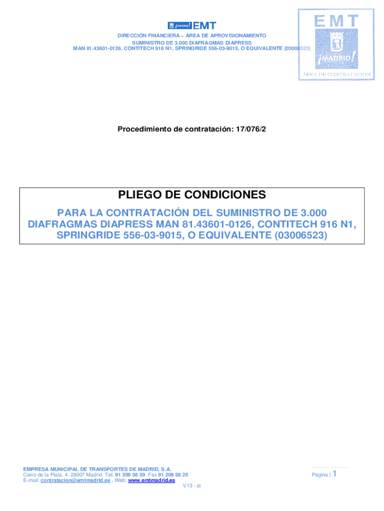DIRECTION FINANCIER AREA DE APROVISIONAMIENTO MINISTRY DE 3,000 DIAGRAMS DISTRESS MAN 81.436010126, CONT ITECH 916 N1, SPRINGTIME 556039015, O EQUIVALENT (03006523)Procedimiento de contratacin: 17/076/2PLIEGO