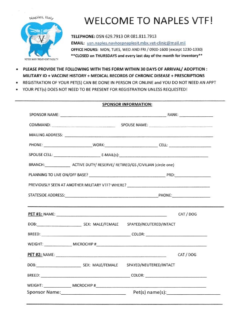 EMAIL: USN. Naples.navriospnap, esit.mbx.vetclinic@mail.mil