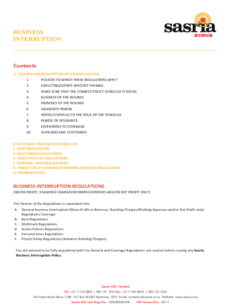 BUSINESS INTERRUPTIONContents A. GENERAL BUSINESS INTERRUPTION REGULATIONS 1.POLICIES TO WHICH THESE REGULATIONS APPLY2.DEDUCTIBLES/FIRST AMOUNT PAYABLE3.MAKE SURE THAT THE CORRECT POLICY SCHEDULE