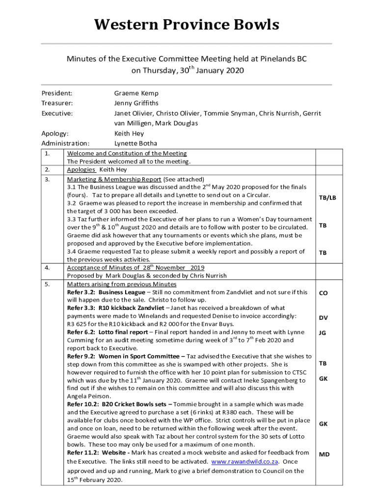 Western Province Bowls Minutes of the Executive Committee Meeting held at Pin elands BC on Thursday, 30th January 2020 President: Treasurer: Executive: Apology: Administration: 1. 2. 3.4. 5. Game