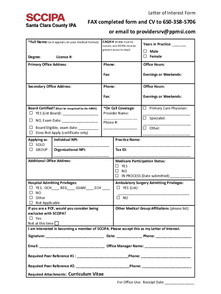 Letter of Interest Form FAX completed form and CV to 6503585706 or email to providersrv@ppmsi.com *Full Name (as it appears on your medical license): CASH # (Profile must recurrent, and SCC IPA must