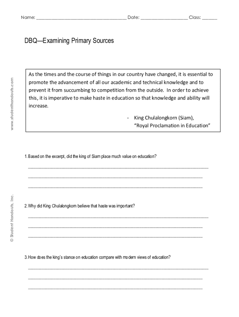 Name: ___ Date: ___ Class: ___www.studenthandouts.comDBQExamining Primary Sources As the times and the course of things in our country have changed, it is essential to promote the advancement of all
