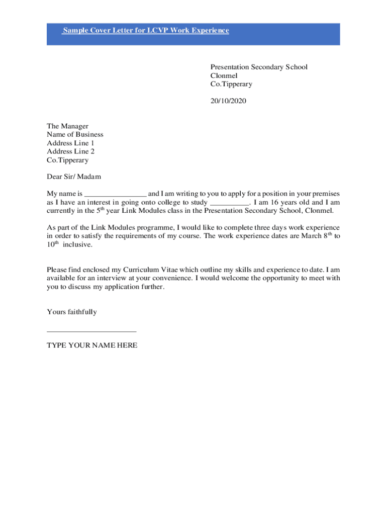 Sample Cover Letter for CVP Work ExperiencePresentation Secondary School Colonel Co. Tipperary 20/10/2020The Manager Name of Business Address Line 1 Address Line 2 Co. Tipperary Dear Sir/ Madam My