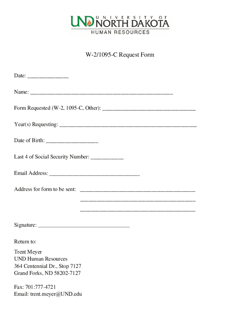 W2/1095C Request Form Date: ___ Name: ___ Form Requested (W2, 1095C, Other): ___ Year(s) Requesting: ___ Date of Birth: ___ Last 4 of Social Security Number: ___ Email Address: ___ Address for form