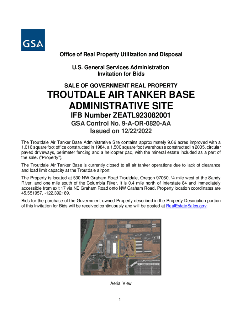 Office of Real Property Utilization and Disposal U.S. General Services Administration Invitation for Bids SALE OF GOVERNMENT REAL PROPERTYTROUTDALE AIR TANKER BASE ADMINISTRATIVE SITE IF Number ZEATL923082001