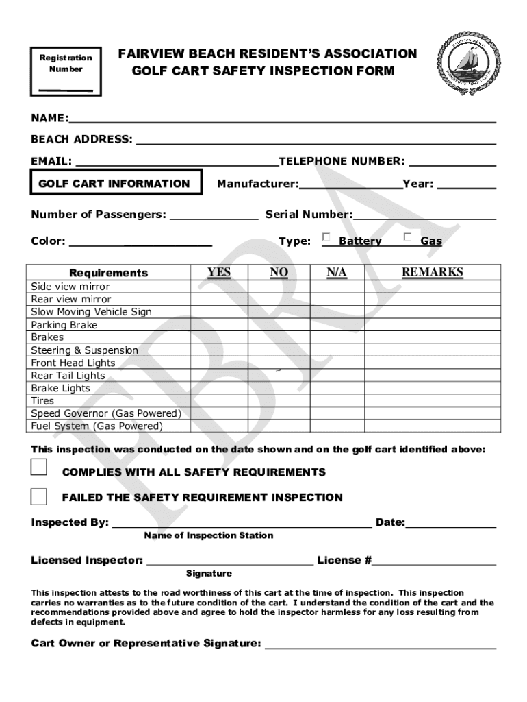 Registration NumberFAIRVIEW BEACH RESIDENTS ASSOCIATION GOLF CART SAFETY INSPECTION FORENAME: BEACH ADDRESS: EMAIL:TELEPHONE NUMBER:GOLF CART INFORMATIONManufacturer:Number of Passengers: Color:Serial