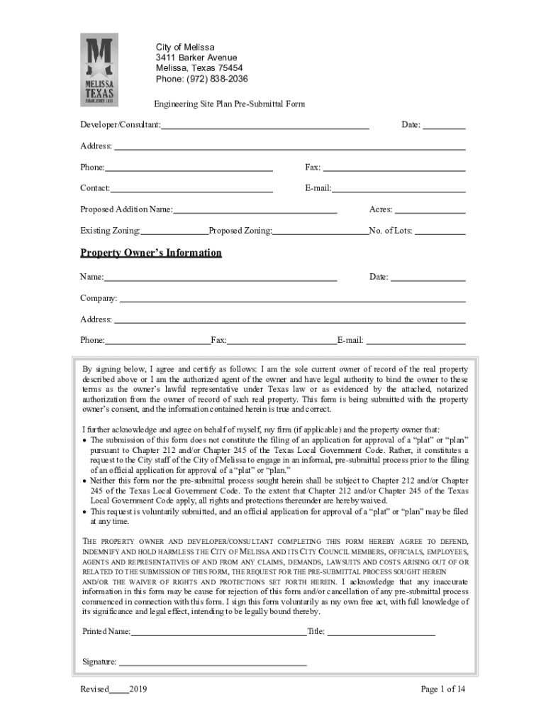 Get the free Final Engineering Site Plan Pre-Submittal Form PDF - City of Melissa