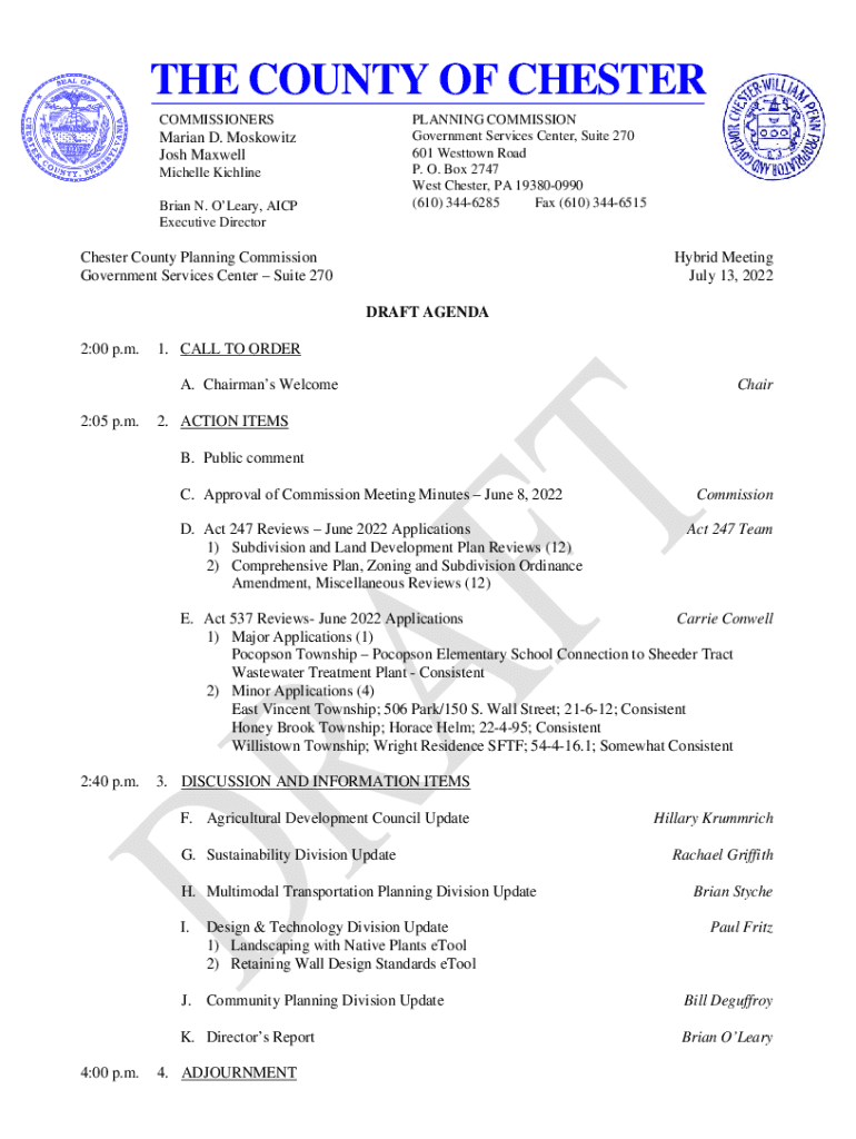 THE COUNTY OF CHESTER COMMISSIONERSPLANNING COMMISSION Government Services Center, Suite 270 601 West town Road P. O. Box 2747 West Chester, PA 193800990 (610) 3446285 Fax (610) 3446515Marian D. Moskovitz