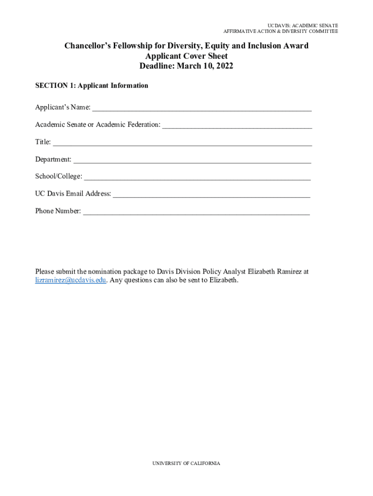 McDavis: ACADEMIC SENATE AFFIRMATIVE ACTION & DIVERSITY COMMITTEEChancellors Fellowship for Diversity, Equity and Inclusion Award Applicant Cover Sheet Deadline: March 10, 2022, SECTION 1: Applicant