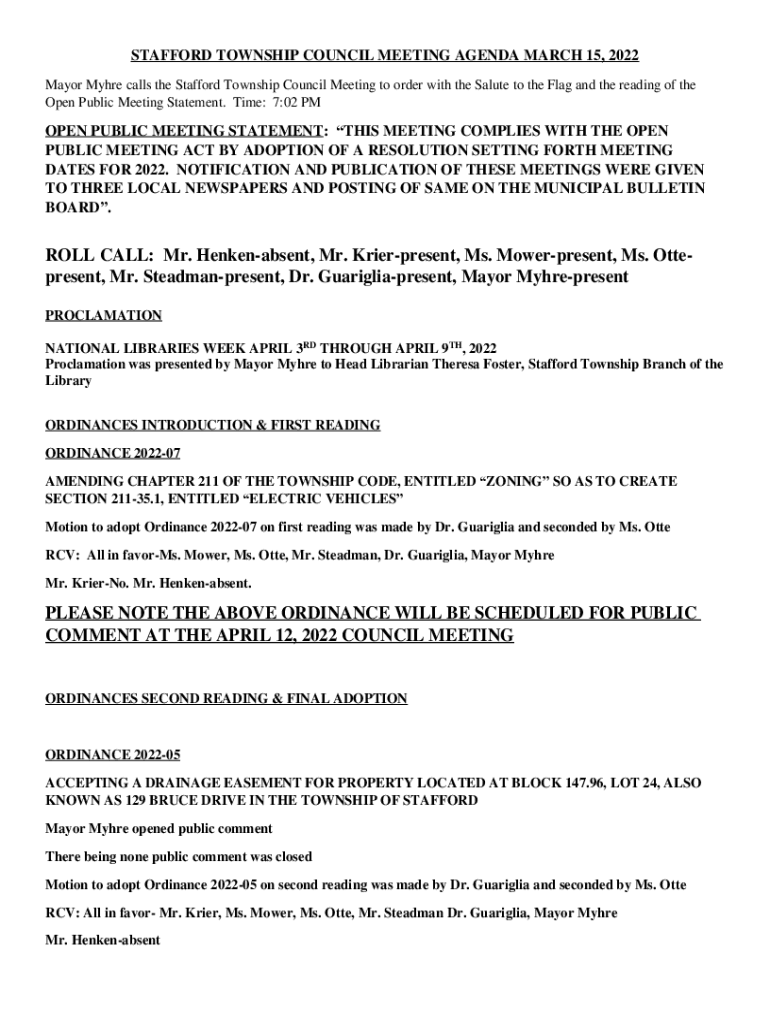 STAFFORD TOWNSHIP COUNCIL MEETING AGENDA MARCH 15, 2022, Mayor More calls the Stafford Township Council Meeting to order with the Salute to the Flag and the reading of the Open Public Meeting Statement.