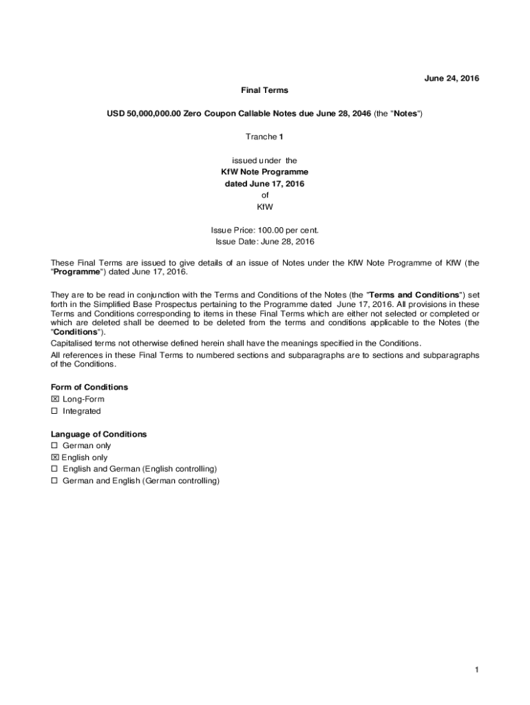 June 24, 2016, Final Terms USD 50,000,000.00 Zero Coupon Callable Notes due June 28, 2046 (the \” Notes\”) Tranche 1 issued under the KFC Note Program dated June 17, 2016, of KFC Issue Price:
