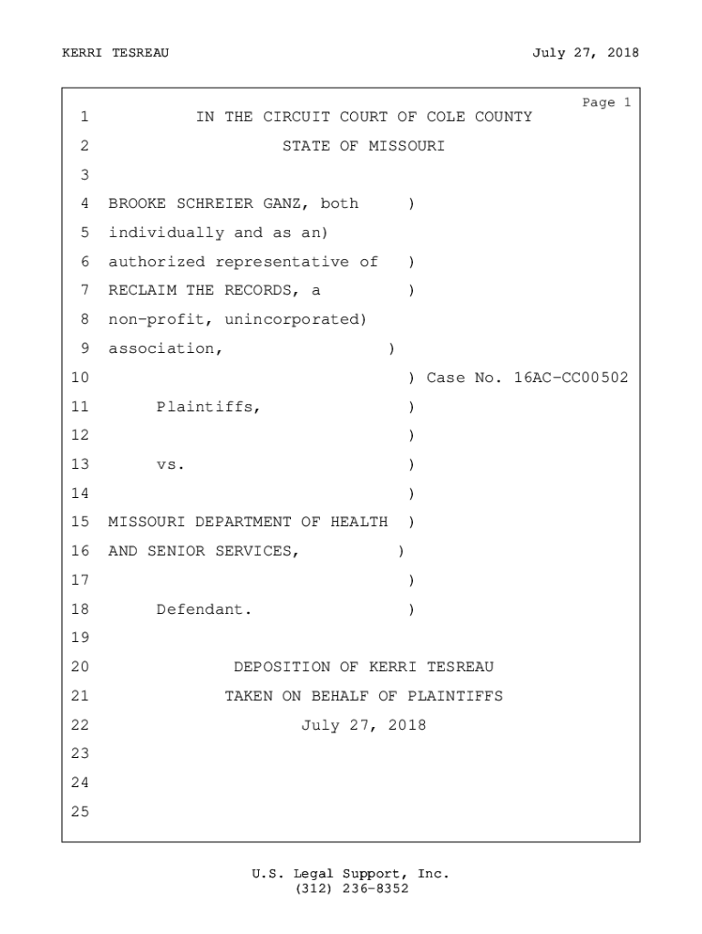 KERRI TESREAUJuly 27, 2018Page 11 IN THE CIRCUIT COURT OF COLE COUNTY 2 STATE OF MISSOURI 3 4 BROOKE SCHREIBER GANG, both) 5 individually and as an) 6 authorized representative of) 7 RECLAIM THE RECORDS,