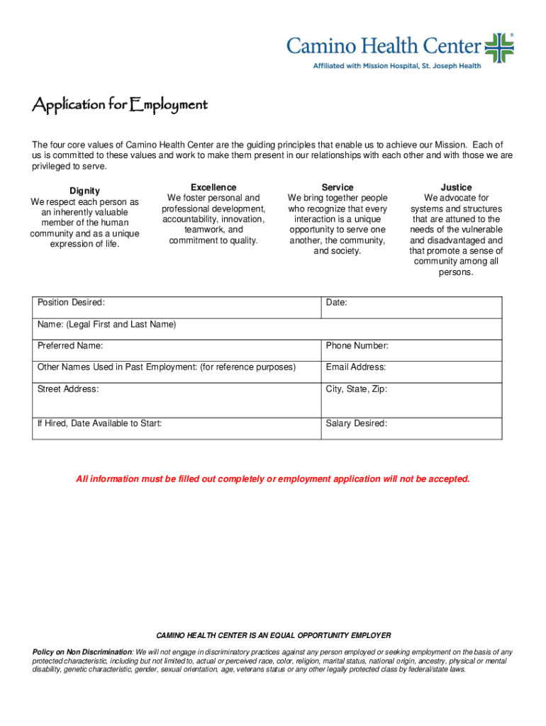 Application for Employment The four core values of Camino Health Center is the guiding principles that enable us to achieve our Mission. Each of us is committed to these values and work to make them