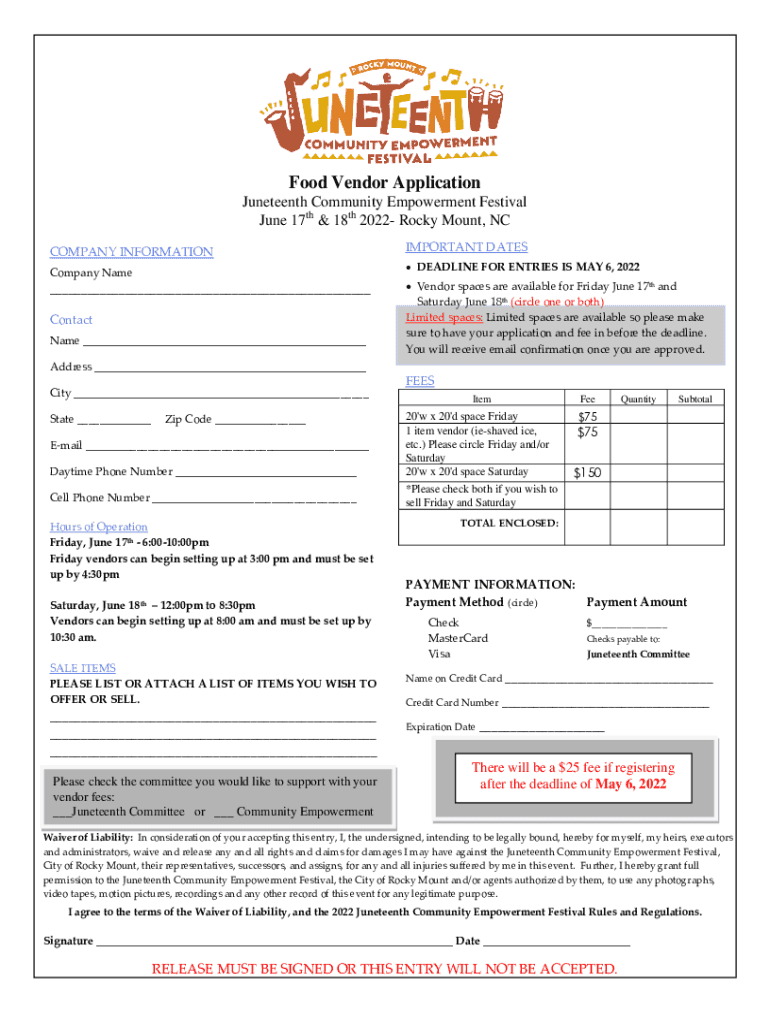 Food Vendor Application Juneteenth Community Empowerment Festival June 17th & 18th 2022 Rocky Mount, NC COMPANY INFORMATION Company Name___ Contact Name ___IMPORTANT DATES DEADLINE FOR ENTRIES IS