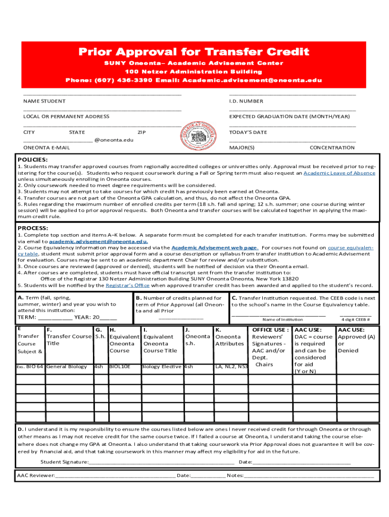 This document contains both information and form fields. To read information, use the Down Grow from a form field. Prior to Approval for Transfer Credit