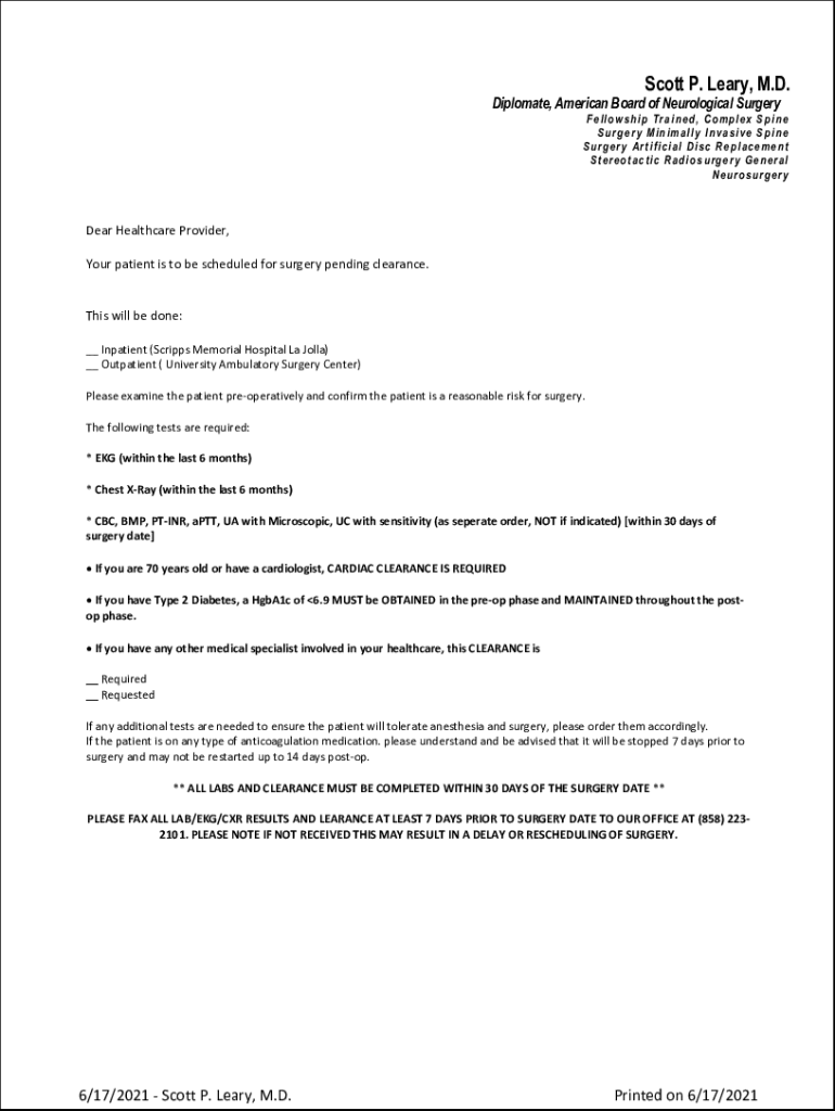 Get the free Surgery-Clearance-Request-Form.pdf - Scott Leary MD
