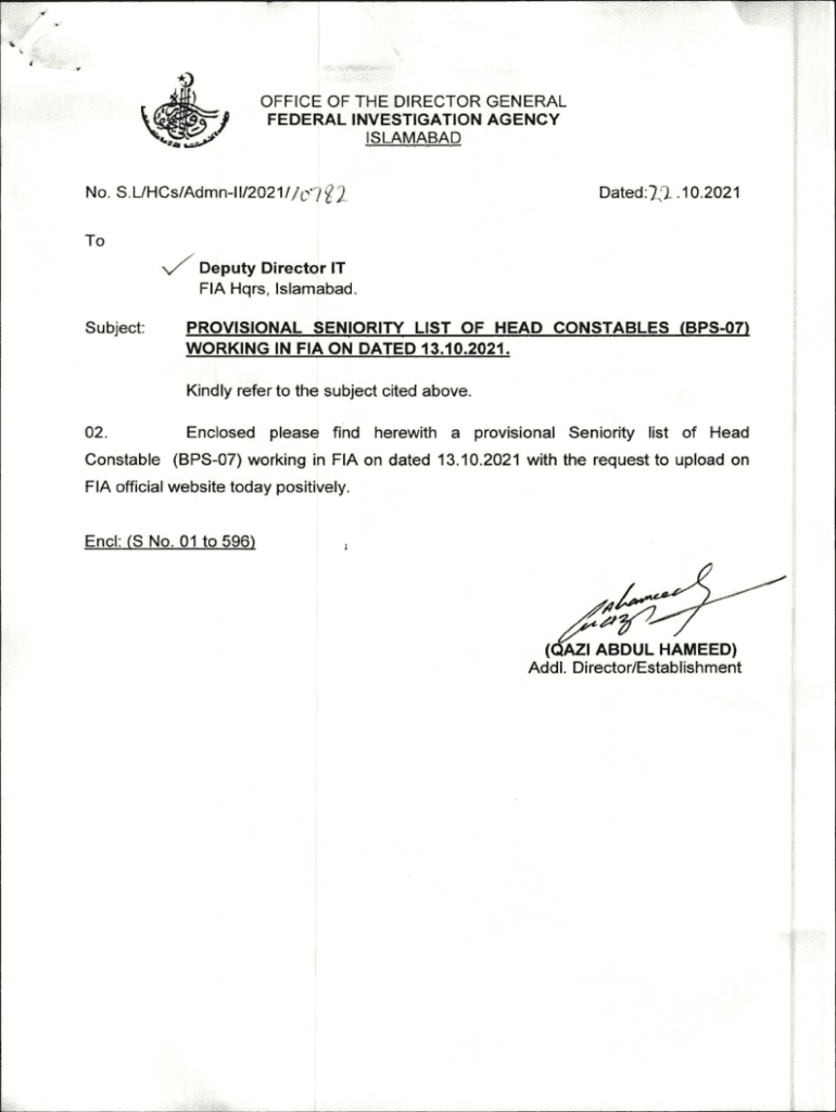 OFFICE OF THE DIRECTOR GENERAL FEDERAL INVESTIGATION AGENCY Islamabad. S. L/HCs/All/2021//c7 ^ 2Dated:7:l. 10.2021To Deputy Director IT FIA Hers, Islamabad. Subject:PROVISIONAL SENIORITY LIST OF HEAD
