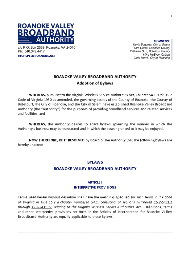 Get the free bylaws.pdf - Roanoke Valley Broadband Authority