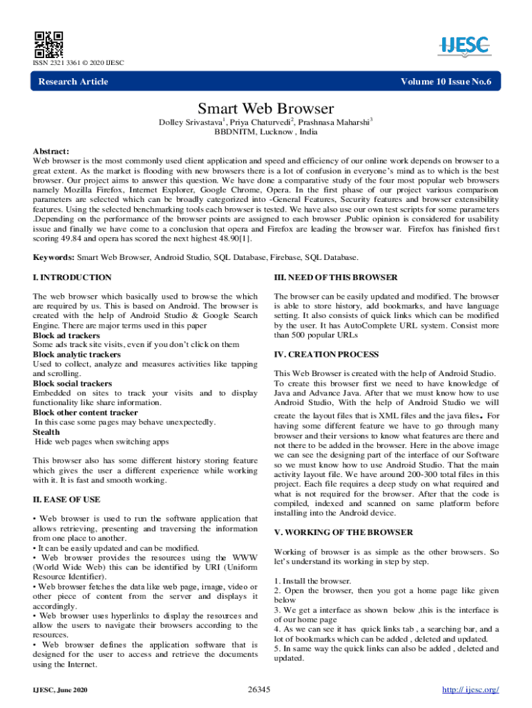 ISSN 2321 3361 2020 IJESCResearch ArticleVolume 10 Issue No.6Smart Web Browser Dolley Srivastava1, Priya Chaturvedi2, Pashas Maharshi3 BENITO, Lucknow, India Abstract: Web browser is the most commonly