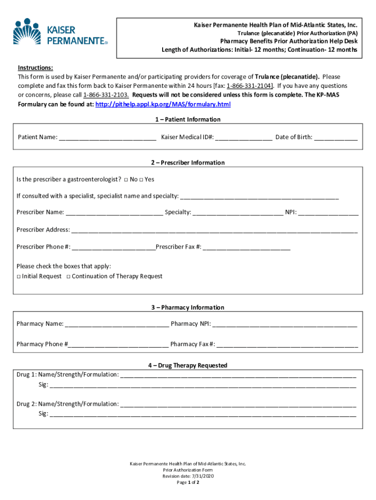 Kaiser Permanent Health Plan of mid-Atlantic States, Inc. Trance (plecanatide) Prior Authorization (PA)Pharmacy Benefits Prior Authorization Help Desk Length of Authorizations: Initial 12 months;