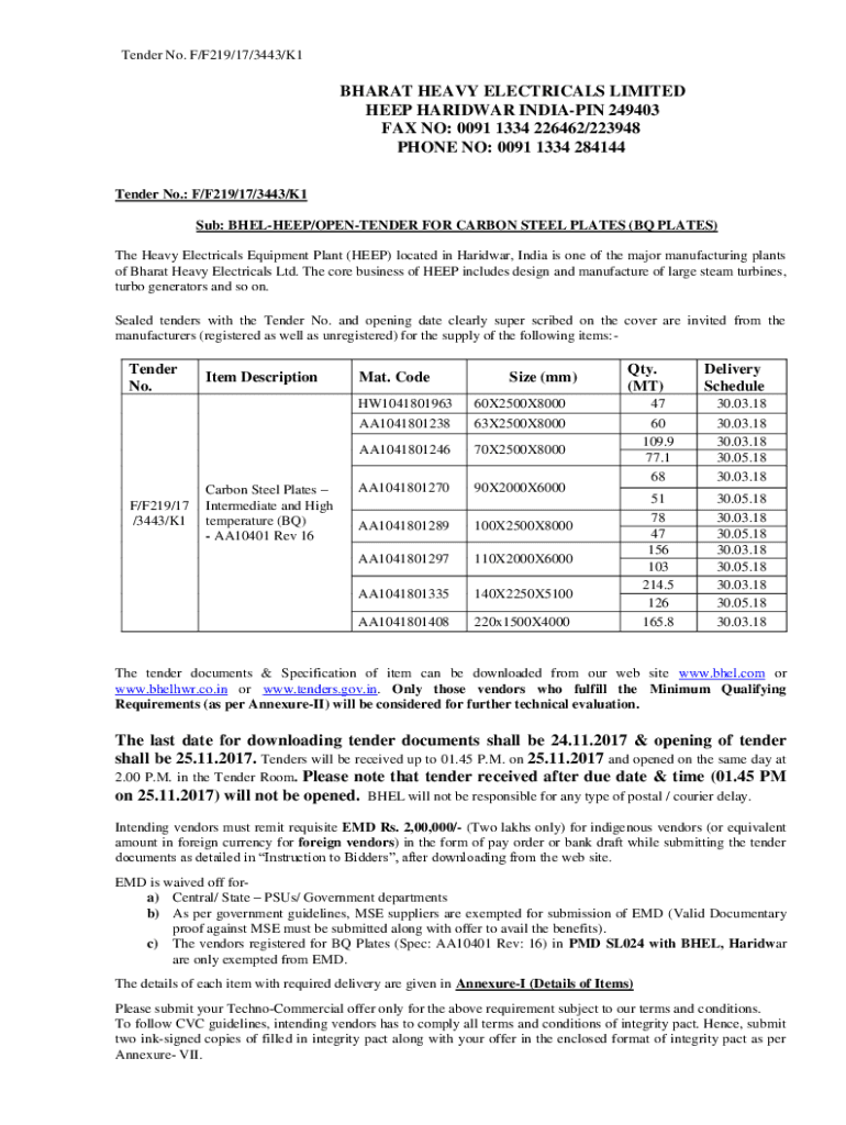 Tender No. F/F219/17/3443/K1BHARAT HEAVY ELECTRICAL LIMITED HEEP HARDWARE INDIA PIN 249403 FAX NO: 0091 1334 226462/223948 PHONE NO: 0091 1334 284144 Tender No.: F/F219/17/3443/K1 Sub: BLEEP/OPEN-ENDED