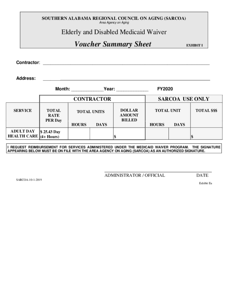 SOUTHERN ALABAMA REGIONAL COUNCIL ON AGING (SARCOMA) Area Agency on AgingElderly and Disabled Medicaid WaiverVoucher Summary SheetEXHIBIT Contractor: ___Address:___ Month: ___Year: ___CONTRACTOR SERVICEWOMAN