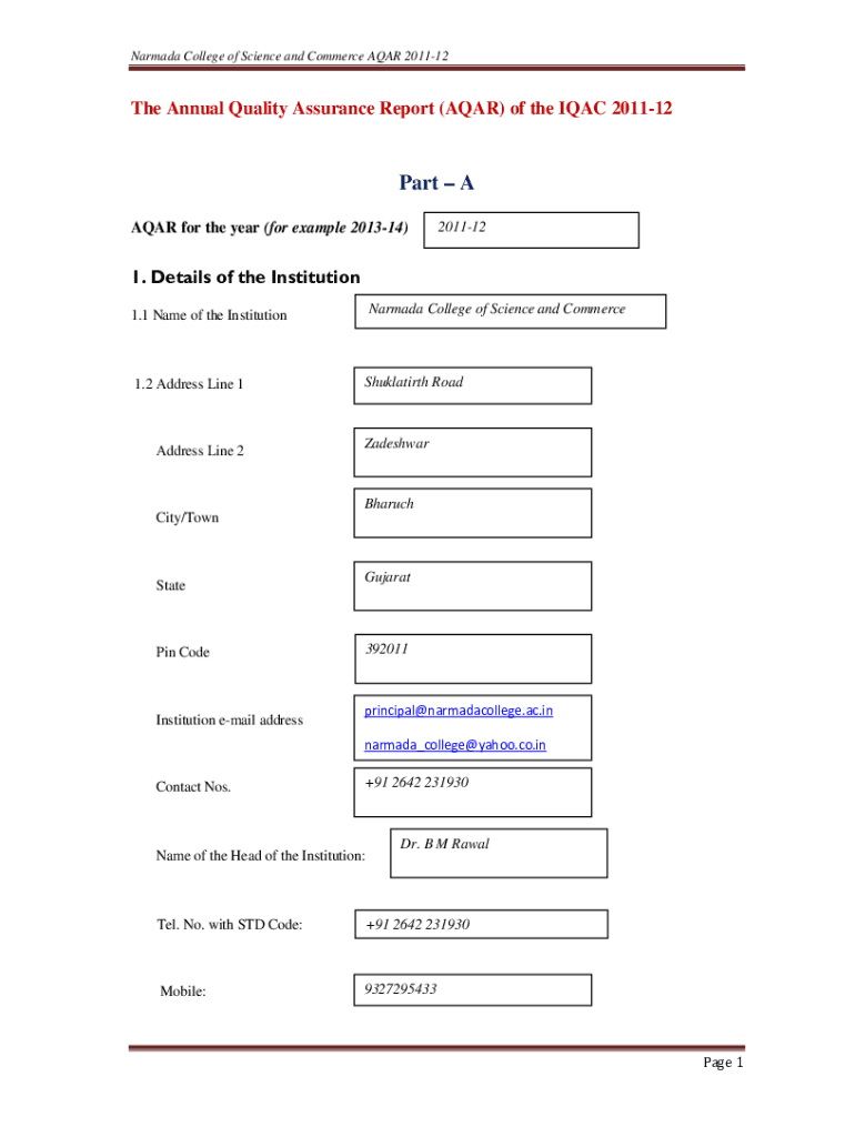 Narmada College of Science and Commerce AGAR 201112The Annual Quality Assurance Report (AGAR) of the IAC 201112Part A AGAR for the year (for example 201314)2011121. Details of the Institution Narmada