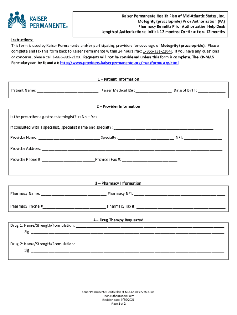 Kaiser Permanent Health Plan of mid-Atlantic States, Inc. Integrity (prucalopride) Prior Authorization (PA) Pharmacy Benefits Prior Authorization Help Desk Length of Authorizations: Initial 12 months;