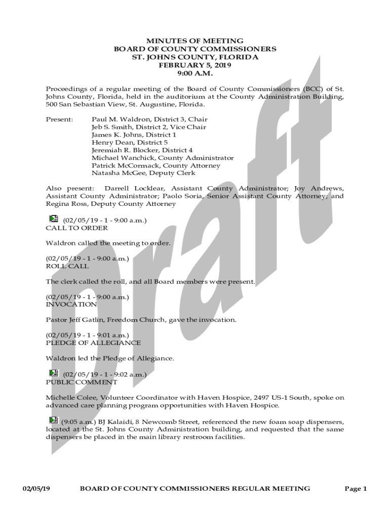 MINUTES OF MEETING BOARD OF COUNTY COMMISSIONERS ST. JOHNS COUNTY, FLORIDA FEBRUARY 5, 2019 9:00 A.M. Proceedings of a regular meeting of the Board of County Commissioners (BCC) of St. Johns County,