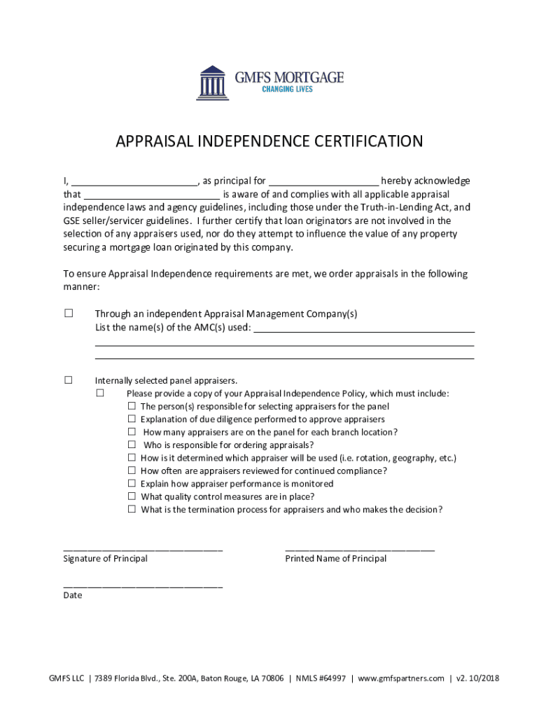 APPRAISAL INDEPENDENCE CERTIFICATION I, ___, as principal for ___ hereby acknowledge that ___ is aware of and complies with all applicable appraisal independence laws and agency guidelines, including