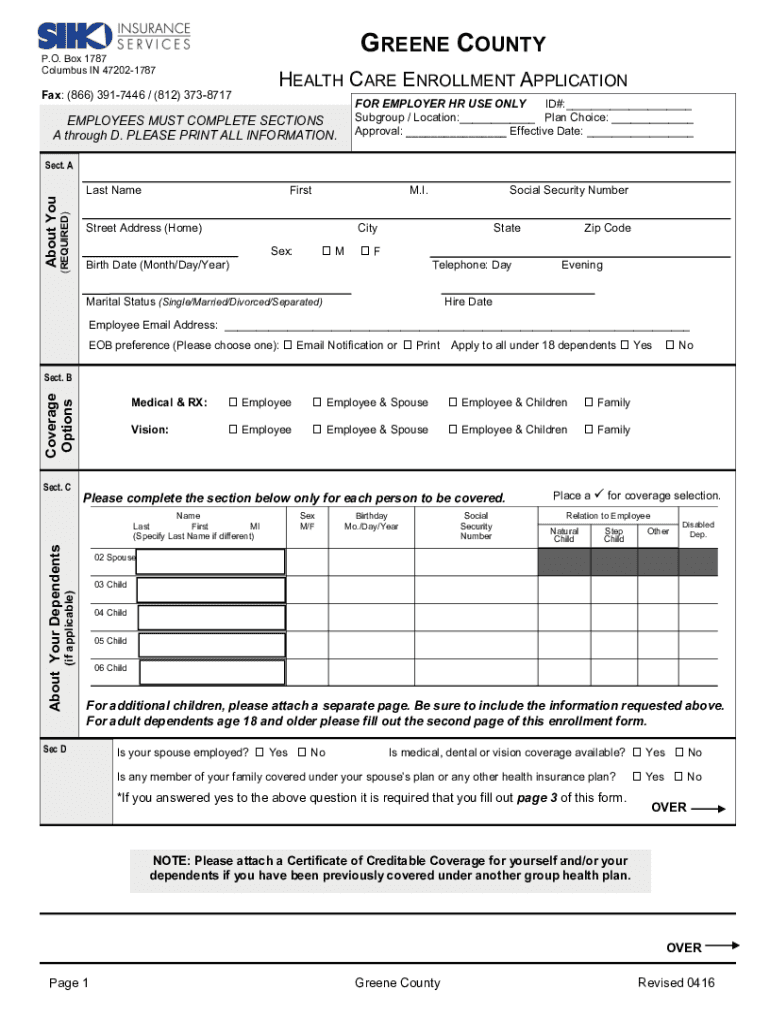Columbus IN 472021787Fax: (866) 3917446 / (812) 3738717HEALTH CARE ENROLLMENT APPLICATIONEMPLOYEES MUST COMPLETE SECTIONS