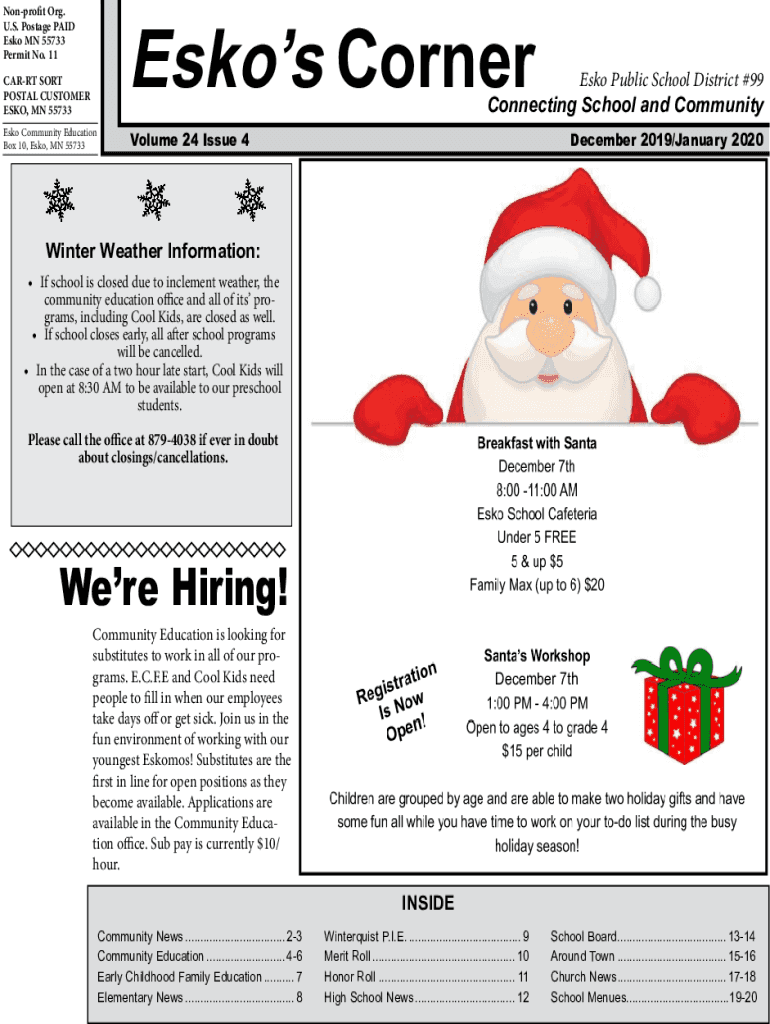 CARRY SORT POSTAL CUSTOMER ESO, MN 55733Eskos Corners Community Education Box 10, ESO, MN 55733Volume 24 Issue 4Nonprofit Org. U.S. Postage PAID ESO MN 55733 Permit No. 11Esko Public School District