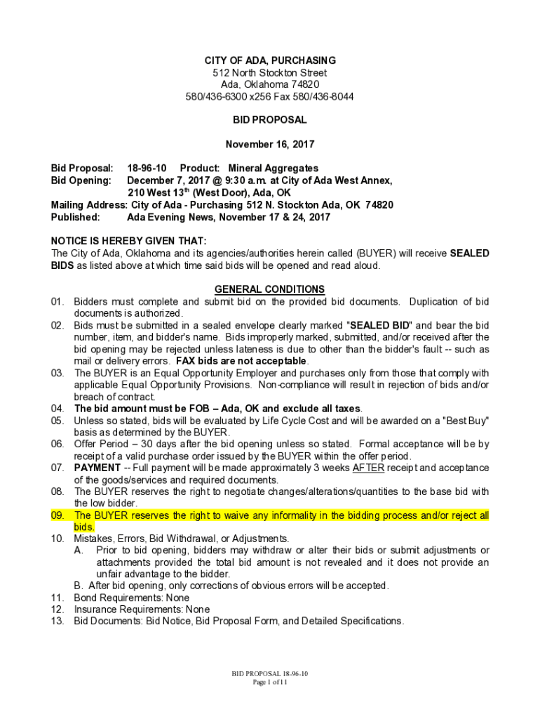 CITY OF ADA, PURCHASING 512 North Stockton Street Ada, Oklahoma 74820 580/4366300 x256 Fax 580/4368044 BID PROPOSAL November 16, 2017, Bid Proposal: Bid Opening:189610 Product: Mineral Aggregates