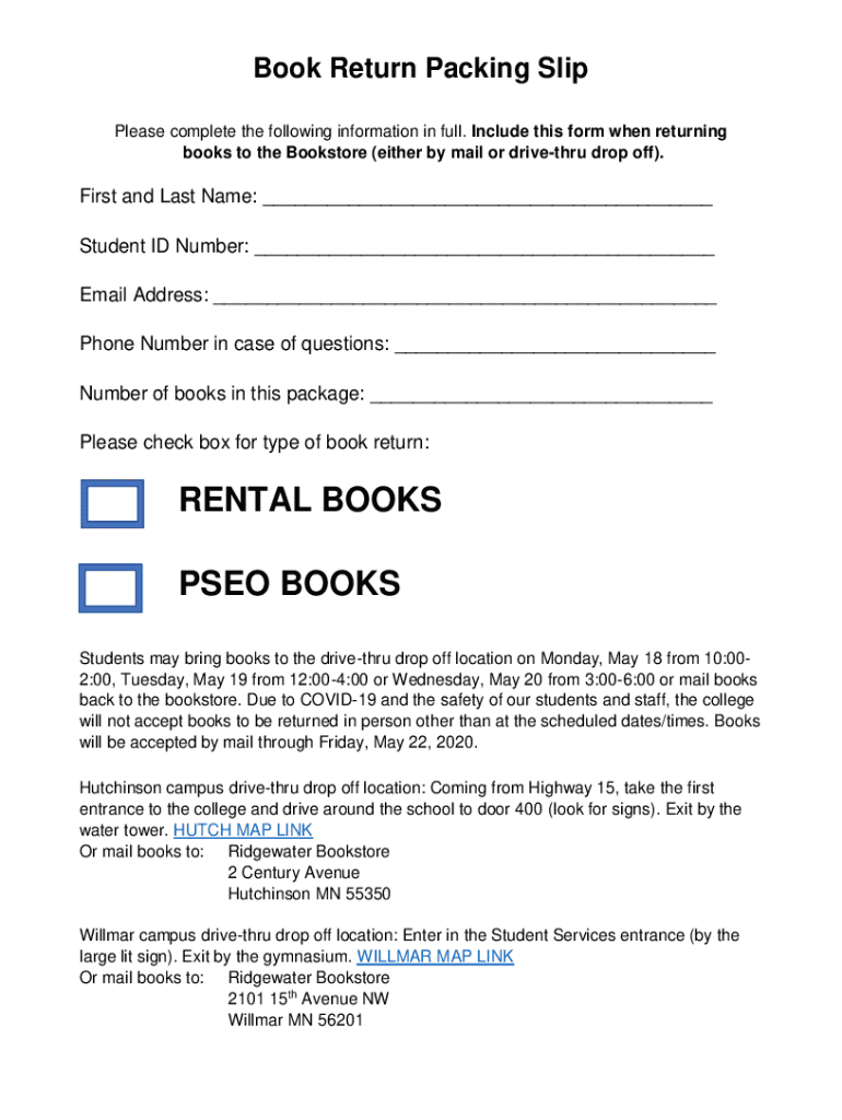 Book Return Packing Slip Please complete the following information in full. Include this form when returning books to the Bookstore (either by mail or drive through drop off). First and Last Name: