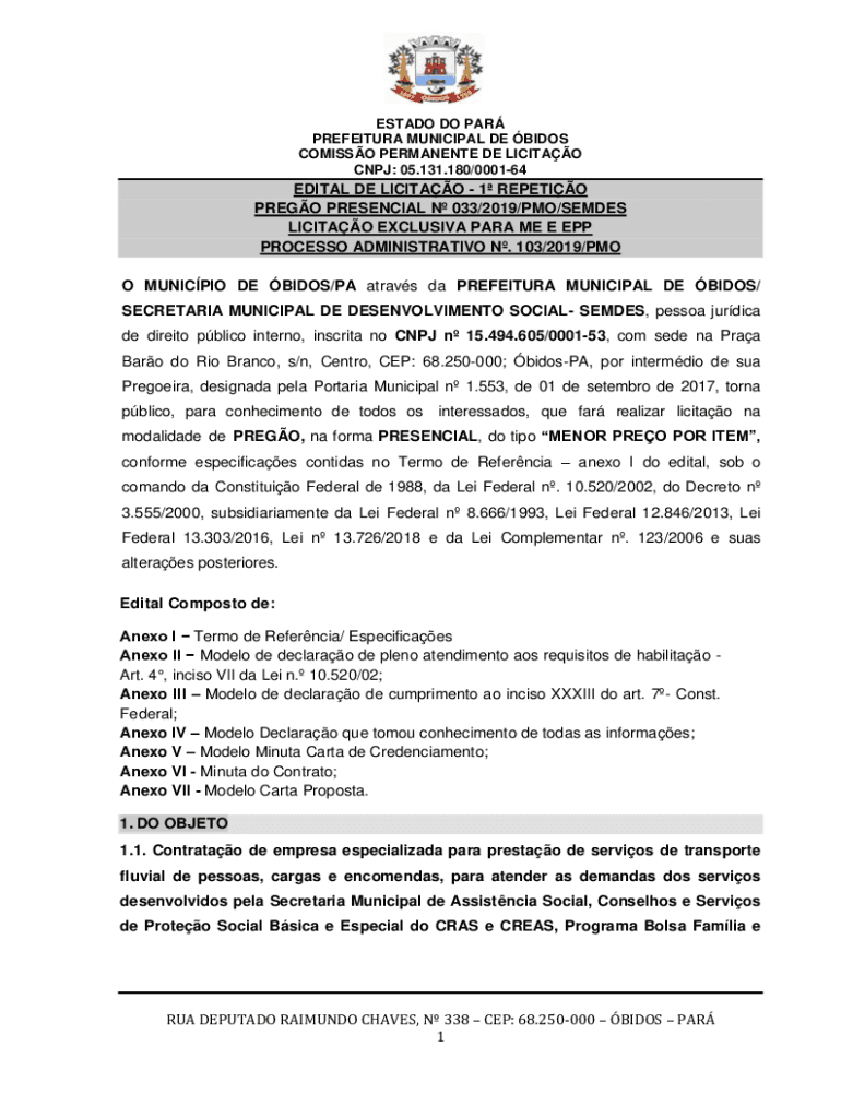 ESTATE DO PAR PREFECTURE MUNICIPAL DE BIDS COMICS PERMANENT DE LICIT AO CNJ: 05.131.180/000164EDITAL DE LICIT AO 1 REPLETION PRESO PRESENCE N 033/2019/PMO/SEM DES LICIT AO EXCLUSIVE PARA ME E EPP