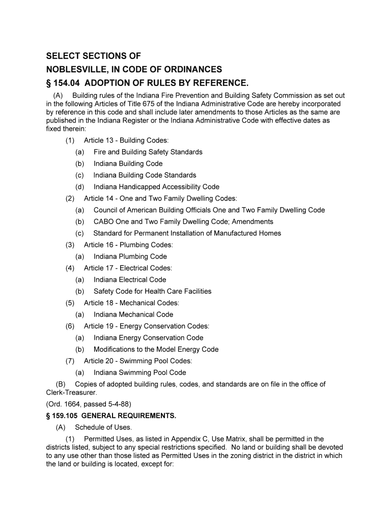 SELECT SECTIONS OF NOBLESVILLE, IN CODE OF ORDINANCES 154.04 ADOPTION OF RULES BY REFERENCE. (A)BuildingrulesoftheIndianaFirePreventionandBuildingSafetyCommissionassetoutinthefollowingArticlesofTitle675oftheIndianaAdministrativeCodeareherebyincorporated