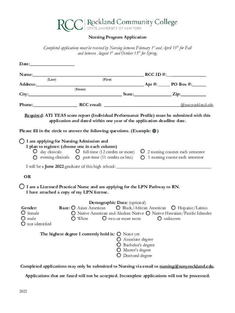 Nursing Program Application Completed applications must be received by Nursing between February 1st and April 15th for Fall and between August 1st and October 15th for Spring. Date: Name: Address:RCC