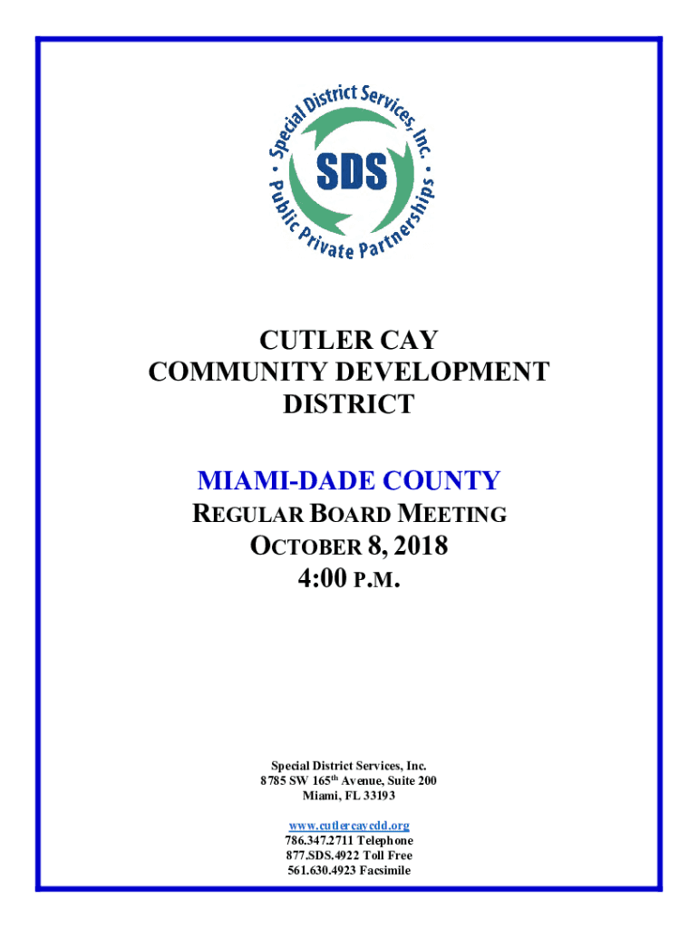 CUTLER CAY COMMUNITY DEVELOPMENT DISTRICT MIA MIDADE COUNTY REGULAR BOARD MEETING OCTOBER 8, 2018 4:00 P.M. Special District Services, Inc. 8785 SW 165th Avenue, Suite 200 Miami, FL 33193 www.cutlercaycdd.org