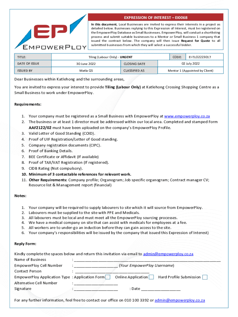 EXPRESSION OF INTEREST EI0068 In this document, Local Businesses are invited to express their interests in a project as detailed below. Businesses replying to this Expression of Interest, must be