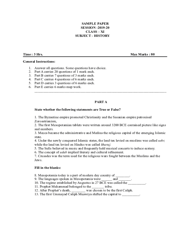 SAMPLE PAPER SESSION 201920 CLASS XI SUBJECT Historicize : 3 Hrs. Max Marks : 80General Instructions: 1. 2. 3. 4. 5. 6. Answer all questions. Some questions have choice. Part A carries 20 questions